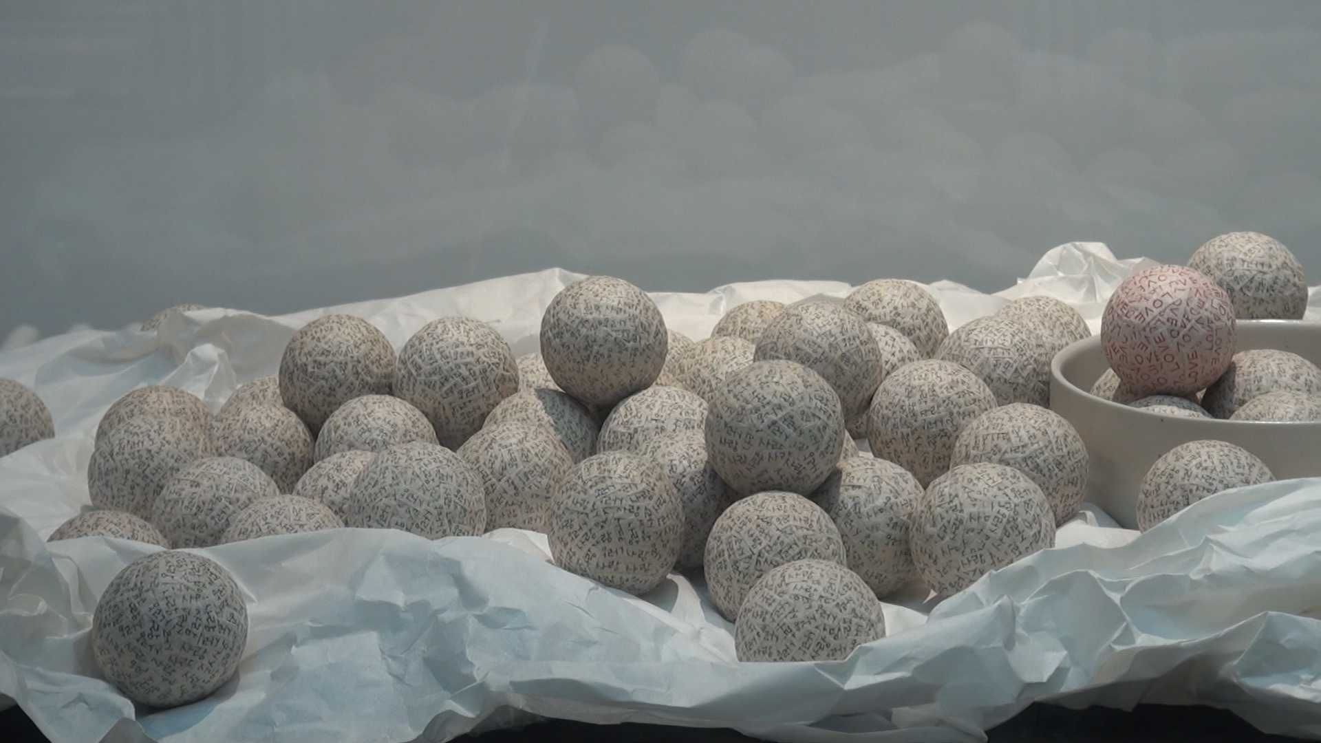 Betty’s main piece in the exhibition represents fluttering feelings between Korea and the UK, showcasing a pivotal scene from the film Past Lives, directed by Korean Canadian filmmaker Celine Song, with dialogue in both English and Korean.