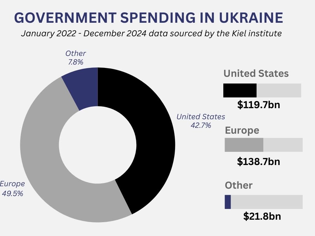 Collectively, Europe contributes the most in aid to Ukraine. Trump's claims that the US has sent upwards of $300bn appear to be disproportionate as compared independently collected data. The US is still the largest single contributor, however.